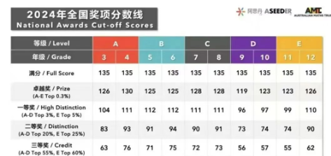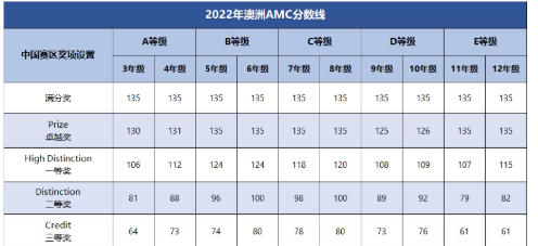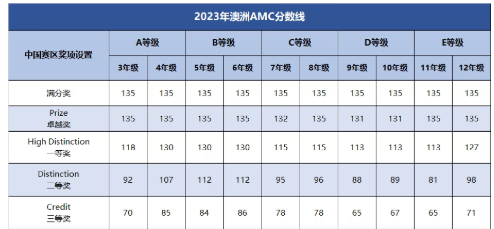 03.澳洲AMC的拿奖难度 澳洲AMC题目难度梯度大,前 20题正确率较高,后5题是拿高分的关键,需勤加练习,掌握答题技巧。但是近年来澳洲AMC参赛人数增加,竞争加剧,需系统训练提升解题速度与准确率。 👉奖项设置 🏆成就奖:满分的同学将获得该奖项; Prize(卓越奖):等级A~E前0.3%; High Distinction(一等奖):等级A~D前3%,等级E前5%; Distinction(二等奖):等级A~D前20%,等级E前25%; Credit(三等奖):等级A~D前55%,等级E前60%; Proficiency(数学技能奖):分数线每年都有波动.; 👉近三年澳洲AMC分数线