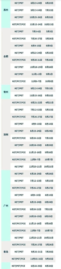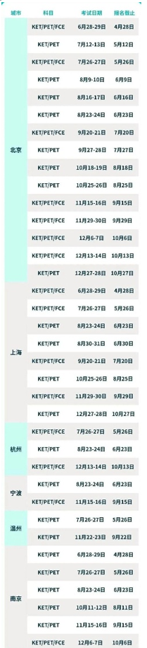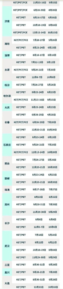 KET/PET/FCE是剑桥大学考试委员会推出的全球通用英语五级考试(MSE)级别。 剑桥五级考试体系 小学段重点突破前两级,初中冲击FCE已成一线城市升学"隐形竞争力"。 KET考试在上海、北京、青岛、济南、天津、南京、深圳、杭州、广州、武汉、成都、重庆、苏州、哈尔滨、太原、石家庄、潍坊、淄博、厦门、温州、宁波、常州、金华、绍兴、湖州、嘉兴、义乌、西安、合肥、沈阳、长沙,等均有线下考位,考位有限,抢先占位! 以下是各城市2025年全年剑桥KET/PET/FCE考试时间,报名截止时间都给大家整理好了,有考试意向的一定要提前规划好时间! 2025下半年各城市