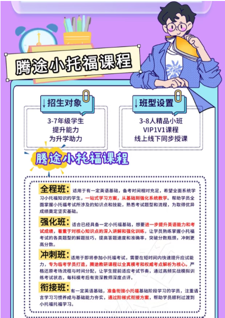 腾途英语课程培训班针对想要备考小托福的学生们,腾途教育特设小托福备考课程,针对不同年龄的不同学习阶段的重点内容为基础,系统地学习英语知识体系,并带领学生提升英语水平!