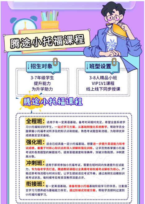 03.腾途小托福课程 腾途英语课程培训班针对想要备考剑桥少儿英语的学生们,腾途教育特设英语备考课程,针对不同年龄的不同学习阶段的重点内容为基础,系统地学习英语知识体系,并带领学生提升英语水平!