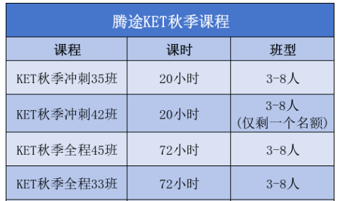 03.腾途国际数学竞赛/英语标化课程 针对备考袋鼠数学竞赛+KET的学生们,腾途特设袋鼠数学数学和KET秋季培训课程。针对不同年龄的不同学习阶段的重点内容为基础,系统地学习国际数学竞赛/英语标化的知识体系,并带领学生学习数学/英语知识体系!具体课程安排如下: