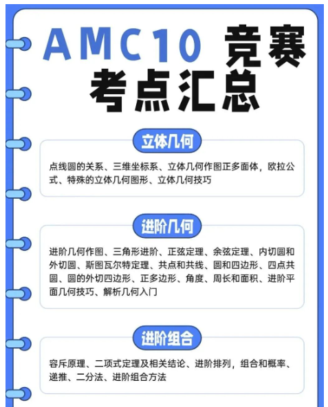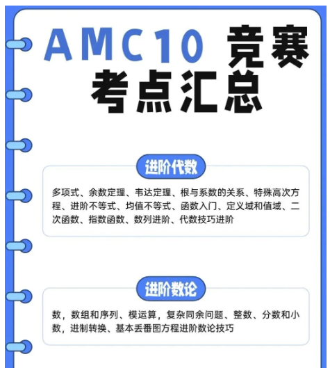 AMC10避坑指南 【整理错题,查漏补缺】 刷题过程中出现错误,往往意味着同学们在某一方面的疏漏,要不是知识点掌握不熟练,要不就是某项技巧没掌握,要不就是因为其他的原因。 建议同学们在备考的过程中可以准备一个错题本, 将自己的错题整理起来,归类总结,及时调整,同样也方便自己后续回顾。 【总结方法和做题技巧】 AMC10数学竞赛的题目并不是直白的1+1=2,题目中会涉及到非常多的解题技巧和答题技能。所以,在刷题阶段攻克各类问题的同时,同学们还需要善于总结各类技巧和方法,学会灵活运用,为解决更多同类型以及衍生题目做好铺垫。 附AMC10数学竞赛考点汇总⬇️