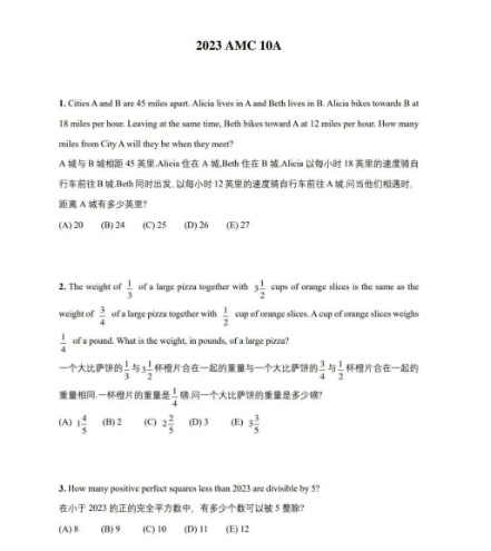 考试形式:线下笔试,共25道选择题 参赛资格:10年级(高一)及以下,且年龄不超过17.5岁 考试时间:AMC10(A卷)2025年11月6日;AMC10(B卷)2025年11月14日 考查范围:初三至高一数学知识,包括代数基础、几何基础(如勾股定理、面积与体积计算等)、简单数论与概率,不涉及三角函数、高等代数及高等几何内容。 评分规则:每题答对得6分,未作答得1.5分,答错不扣分,满分150分。 A卷与B卷说明:两套独立试题,难度与考查范围基本一致。考生可任选其中一场或同时参加,以较高成绩作为评奖及AIME晋级的依据。