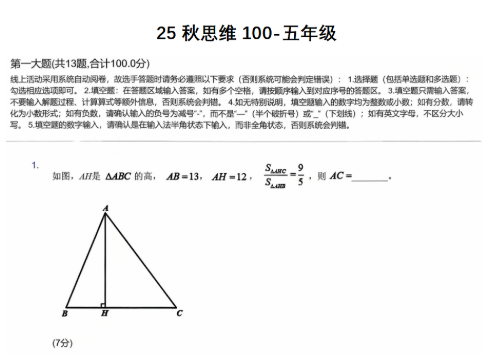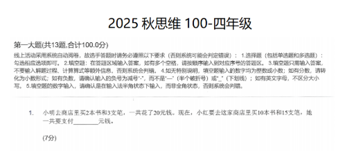 02.思维100的参赛条件和规则 官方网站: 思维100网(www.siwei100.com) ⏩活动时间: 2025年秋季赛9月~11月 ⏩活动方法: ①活动分三、四、五3个年级组分别进行。 ②活动包含线上活动、线下活动两个阶段。 ⏩活动规则: 🔴线上活动:10月18日线上活动 (1)本轮活动采用线上活动的形式进行。即日起,选手可登录思维100网报名参加。 (2)活动统一时间分年级进行。 (3)活动参考内容:2025年“思维100”STEM应用能力科教活动(秋季)参考内容,可登录思维100网浏览。 (4)各年级组具体活动时间: 第一场:四年级,13:00~14:00 第二场:五年级,14:30~15:30 第三场:三年级,16:00~17:00 (5)线上活动注意事项: ①报名时需上传选手手持本人学籍卡(如无学籍卡,可上传身份证或其他带照片的可证明本人身份的证件)的半身照,请提前拍摄好。 ②选手参加线上活动需准备的设备:一台带摄像头功能的台式电脑或笔记本电脑(系统要求Windows 10或MacOS 10.13及以上版本,不能使用iPad等平板设备)用于线上答题及正面摄像监控,一台可登录微信(需用到微信扫码功能)的智能手机用于第二路摄像监控,均要求能连接互联网。电脑需提前下载并安装活动客户端软件,详细操作步骤可于报名后下载操作手册查看。 ③本次线上活动答题将采用逐题显示的模式(页面只显示一道题,答题后通过点击“下一题”的方式进入下一题),且进入下一题后不可返回上一题。 ④报名成功的选手可下载操作手册查看线上活动登录地址及具体要求,并于10月12日13:00~15:00参加一次线上模拟测试(该时间段内任意时间登录即可),以测试设备是否符合要求,并熟悉线上操作。因本次活动需提前下载并安装客户端,且答题形式较以往有较大改变,请报名选手务必按时参加模拟测试,以确保线上活动顺利进行。 (6)报名截止日期:10月4日 🔴决赛:11月16日线下活动 (1)线上活动的入围选手,可继续报名参加线下活动。 (2)各年级组具体活动时间: 第一场:四年级,13:00~14:00 第二场,五年级,14:30~15:30 第三场,三年级,16:00~17:00 ●奖励方法 线上活动各年级组设入围奖,颁发电子证书; 线下活动各年级组设一、二、三等奖,颁发纸质证书。 ●特别说明 “思维100”STEM应用能力编程活动(秋季)的具体安排及报名,请关注网站后续相关通知。 点击文末原文链接查看线上报名指南。 ⏩往届题型设置: 线上活动:选择题、填空题为主